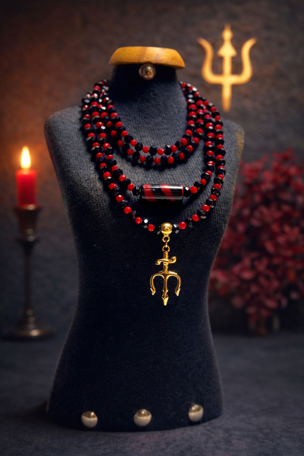 Símbolo de força, poder pessoal e magnetismo espiritual. Este fio de conta é composto por cristais pretos e vermelhos intercalados, firma vermelha e preta e pingente de tridente fêmea dourado, representando a energia, a proteção e o poder de manifestação de Pombagira.